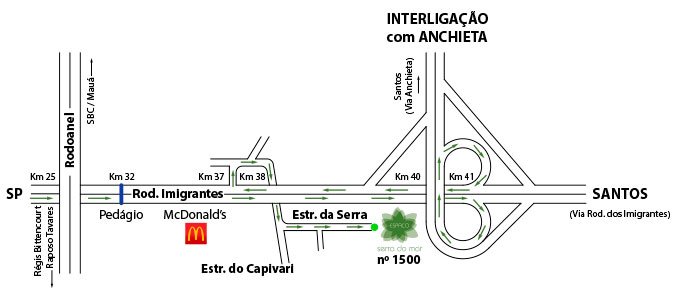 3- Siga as placas “Espaço Serra do Mar” ou “Sítio Serra do Mar” que indicarão o caminho. Para não errar, mantenha-se à direita até passar por baixo de um viaduto, que é a Rodovia dos Imigrantes. Após isso, mantenha-se à esquerda até chegar ao local, na Estrada da Serra, 1500. O percurso total da Rodovia dos Imigrantes até o Espaço Serra do Mar é de apenas 3 Km.