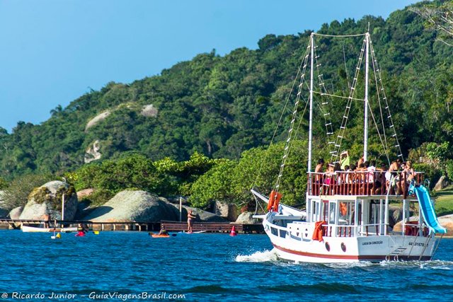 O privilégio de uma vista panorâmica da Lagoa da Conceição, das dunas das Praias da Joaquina, Galheta e da Barra da Lagoa, emolduradas pela vegetação nativa. Outro passeio imperdível em Floripa é o de barco pela Lagoa da Conceição. Com duração média de 1 hora, o percurso permite ver sob outro ângulo as belezas naturais quase intocáveis do outro lado da Lagoa. Há paradas para banhos relaxantes nas águas da Lagoa que são ligadas com o mar por um canal. Você em contato com a natureza.