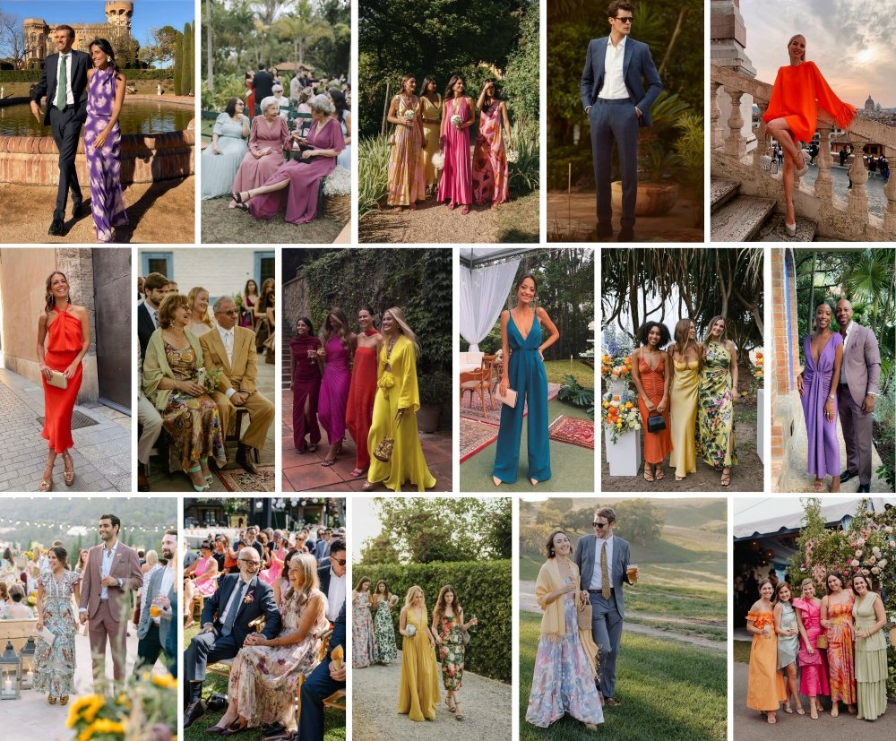 Mulheres com vestidos leves, fluidos e coloridos, longos ou curtos. Nos pés sandálias ou sapatos que permitam andar na grama com conforto. Homens com terno (paletó + calça), com ou sem gravata.