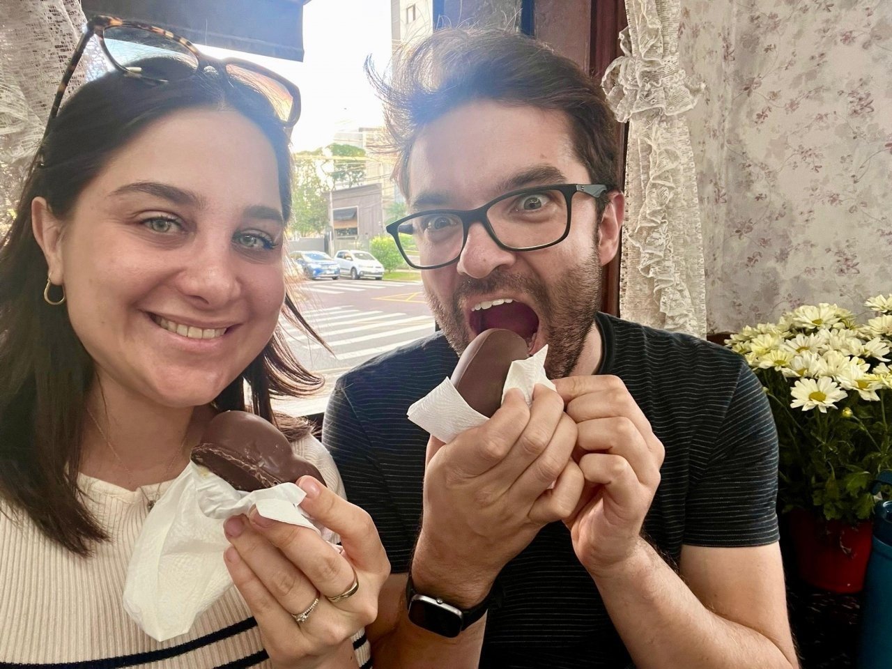 Pense no melhor bombom de morango que você já comeu na vida. Pensou? Então, agora você vai experimentar um melhor que esse! São dois morangos bem vermelhos, doces e suculentos dentro do bombom. A massa de brigadeiro branco tem gema na receita e um sabor especial. O chocolate é maravilhoso. Não tem como explicar o quanto é bom. Uma jóia escondida de Curitiba que só quem vive por aqui conhece. A fachada não chama a atenção, é uma confeitaria raiz, só aceita dinheiro débito ou pix, nada de crédito. Tudo feito por uma mãe e uma filha desde 1988. A noiva vai desde criança comer lá. Além do bombom de morango que é o clássico dos clássicos, tem a coxinha de frango com catupiry que é imperdível também e faz o lanche completo de salgado + sobremesa. Tem outras opções de doces, como bomba, bolo de chocolate e strudell. Salgados tem pastel e empadas também. Tudo o que você comer lá vai ser incrível. Pode confiar. Chega, olha a vitrine, que tem aquele ar anos 90, senta nos bancos estilo canto alemão e desfrute do melhor doce que Curitiba vai oferecer. Aproveite para ir lá, pois infelizmente eles não fazem a versão menor para festa, então para a tristeza dos noivos não será possível tê-los na festa! Mas terão outros bem deliciosos, prometemos!