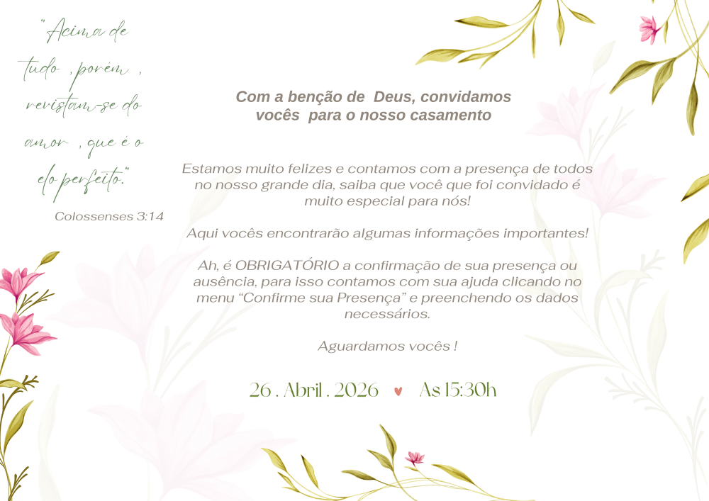 Cada nome nesta lista representa alguém que tem um lugar especial em nossa vida. Vocês não estão aqui por acaso: foram escolhidos com amor e cuidado para testemunhar e celebrar a nossa união.